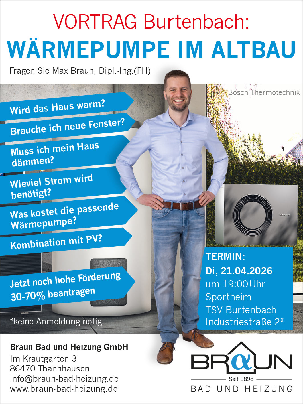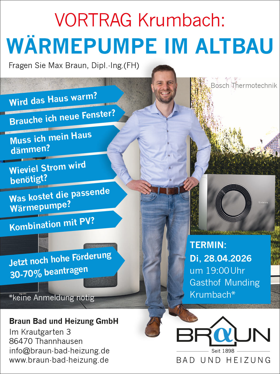 Max Braun, Dipl.-Ing. (FH) zeigt Ihnen Möglichkeiten, Förderungen und konkrete Lösungen – speziell abgestimmt auf Bestandsgebäude. Nutzen Sie die Gelegenheit, Ihre Fragen direkt zu stellen und wertvolle Entscheidungshilfen zu erhalten.